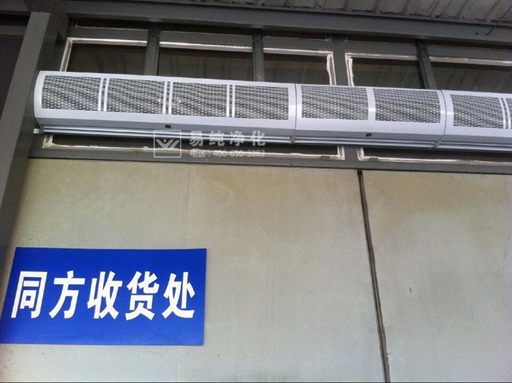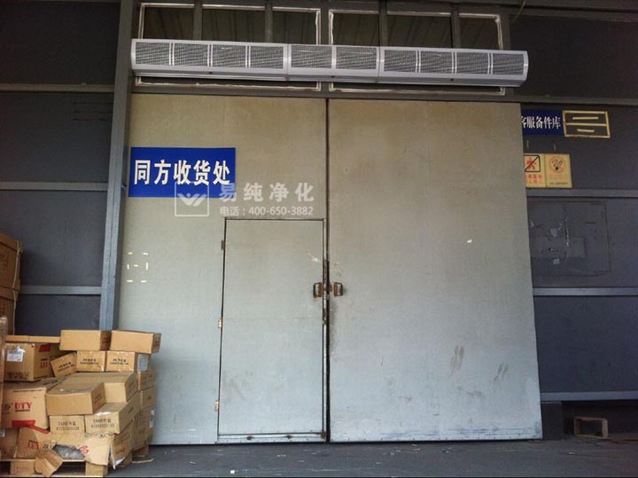 由于物流車輛頻繁進出,物流倉庫門無法像生產車間或其它區域的門經常開關,而物流倉庫門與室外直接接觸,在門敞開的同時會有大量的灰塵及蒼蠅蚊蟲進入。為此清華同方無錫工廠物流負責處的孫先生打電話找到我們,讓我們現場去給他們查看現場,出具方案。 易純公司工程師到達現場之后,查看了地形,位置、風向以及測量了門的寬度和高度,給同方人員提出了超強風風幕機安裝方案,風幕機運轉時產生一股強大的風流,像一道看不見的門簾,起到隔絕室內外空氣,同時隔絕蒼蠅蚊蟲的作用。由于同方物流倉庫門寬度和高度均比常規門大很多,因此易純提出了多臺風幕機組合并排式安裝使用,實現無縫連接,最終安裝完成后風幕機的寬度大于門洞的寬度,造成了無死角運轉。同方物流門上方為玻璃鋼結構,無法固定安裝底板,易純工程師采用了鋼帶縱橫加固,將風幕機壁板固定上鋼帶之上,即保證了風幕機的良好安裝,同時又保證了風幕機的穩固、安全。 下圖為同方風幕機安裝后的實際圖例: